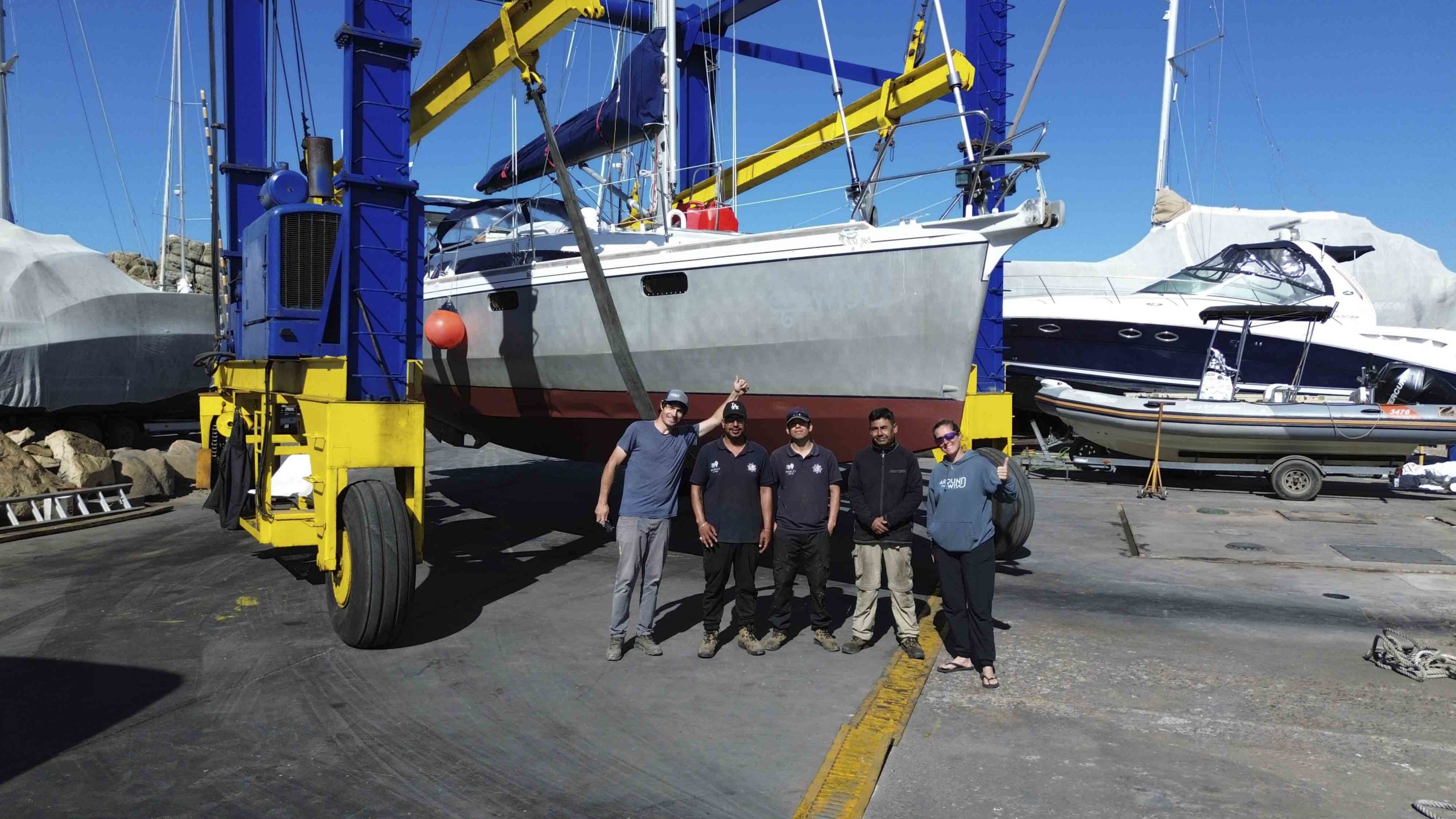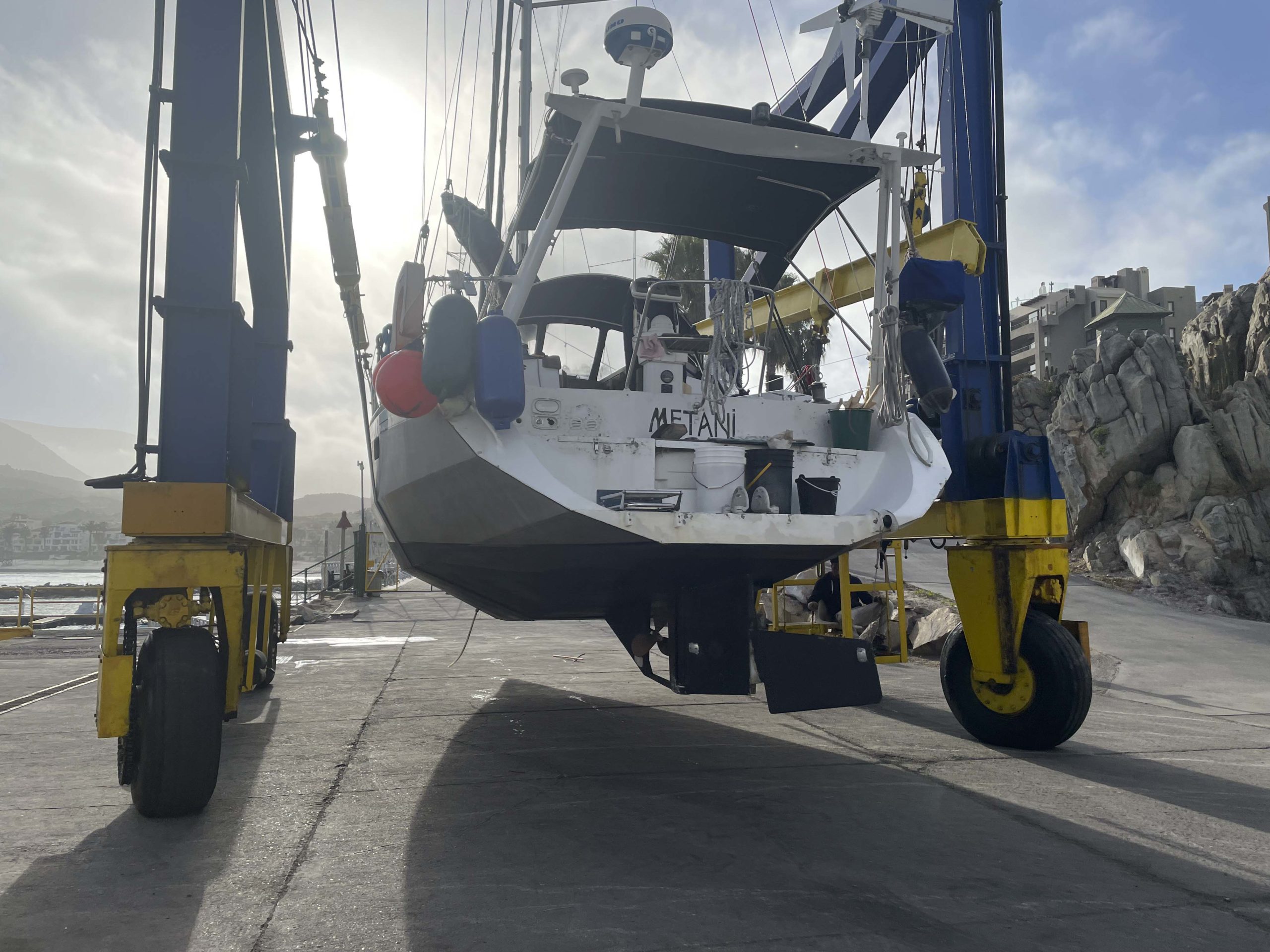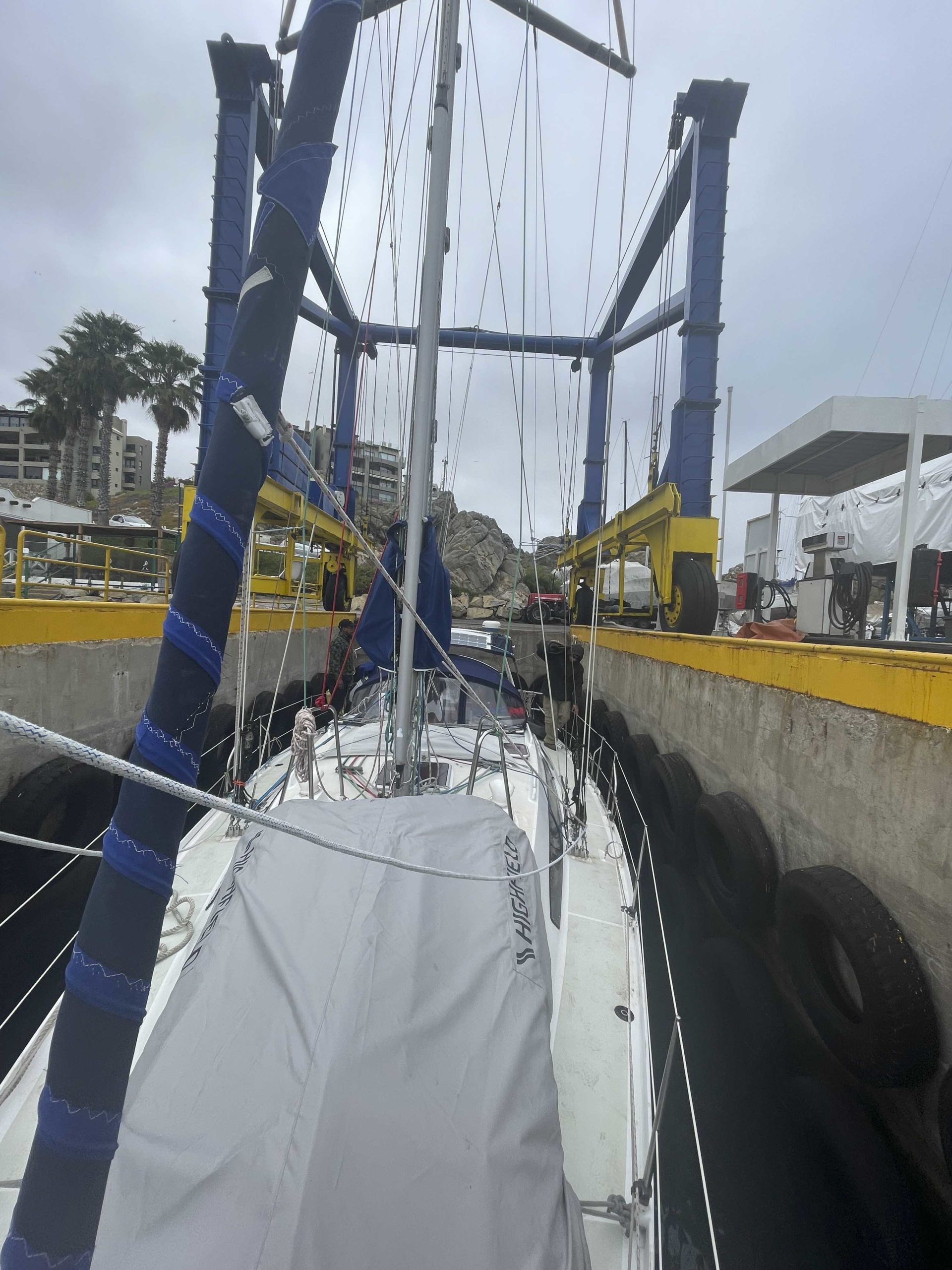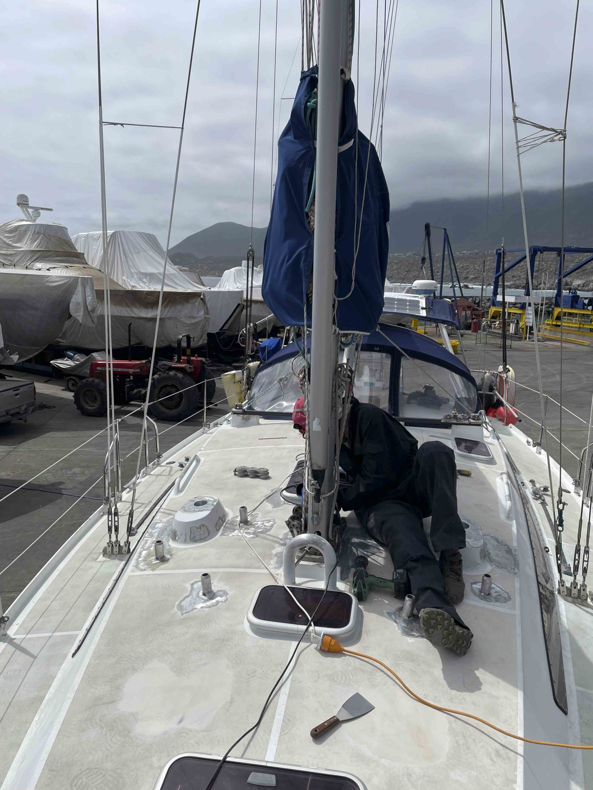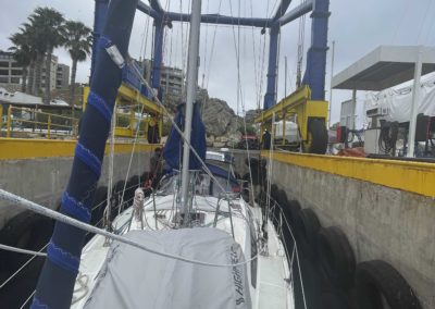 Nous remontons la côte du chili à la recherche d’un endroit sec pour repeindre tout le pont de Metani. C’est à la frontière du désert d’Atacama que nous rejoignons le 2 octobre 2025 une petite marina privée à Las Tacas, située juste avant La Serena, et pouvons sortir le bateau pour entreprendre 1 mois de chantier non stop!