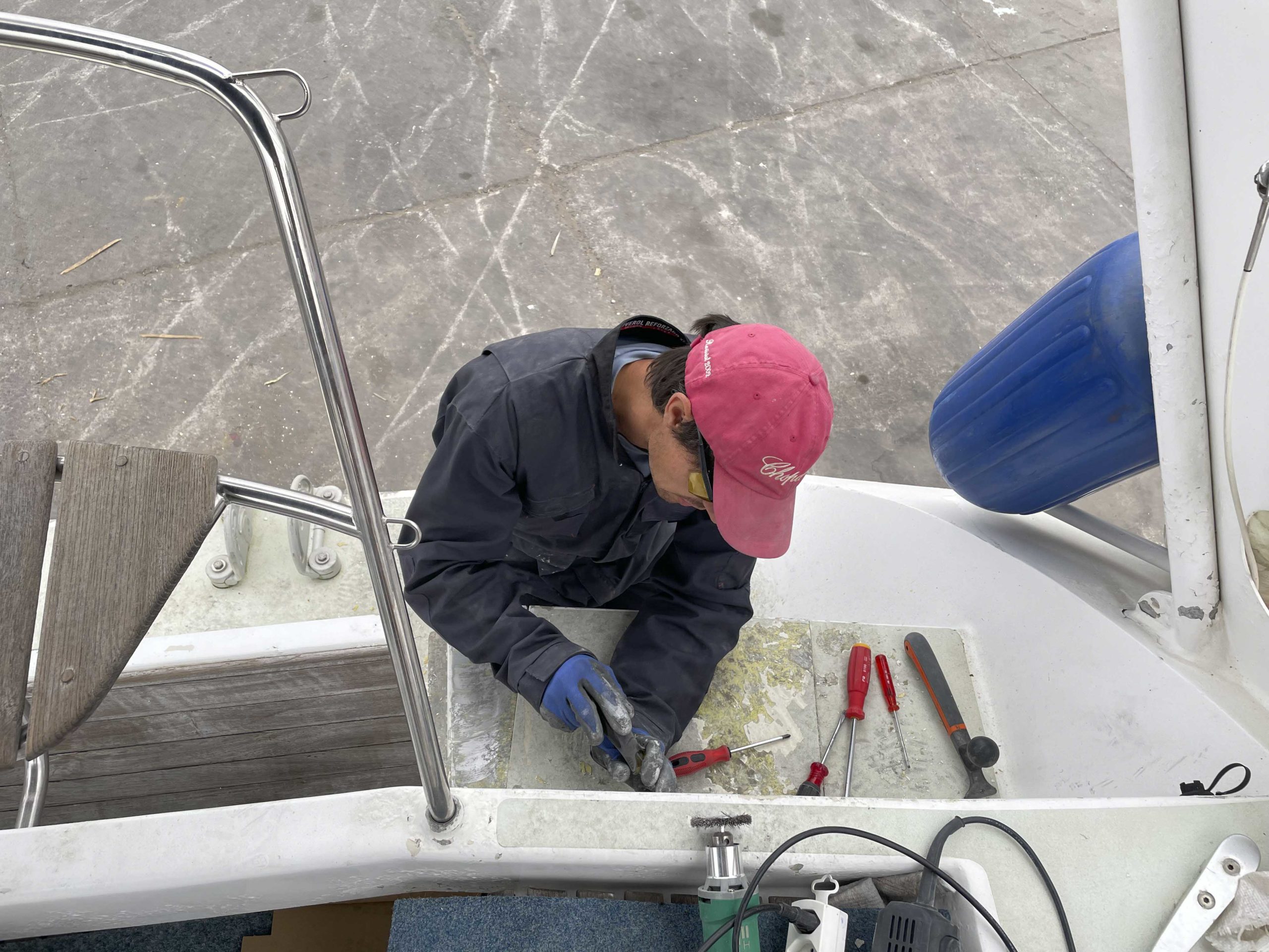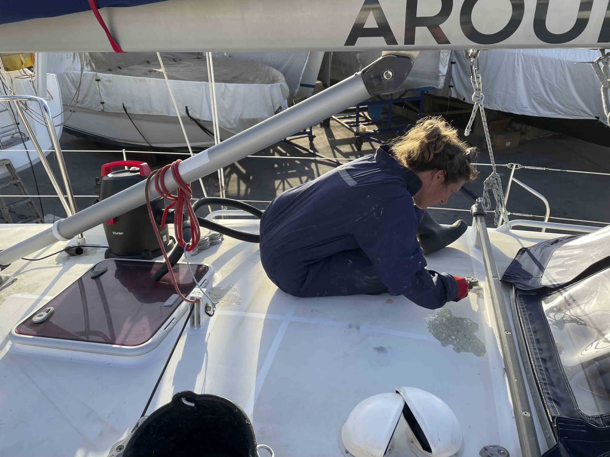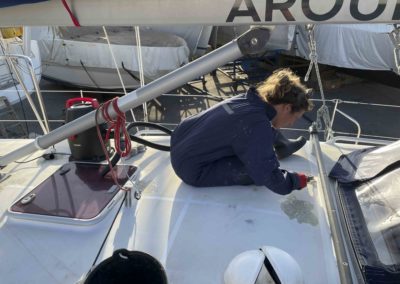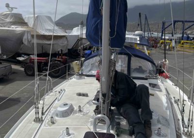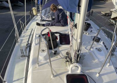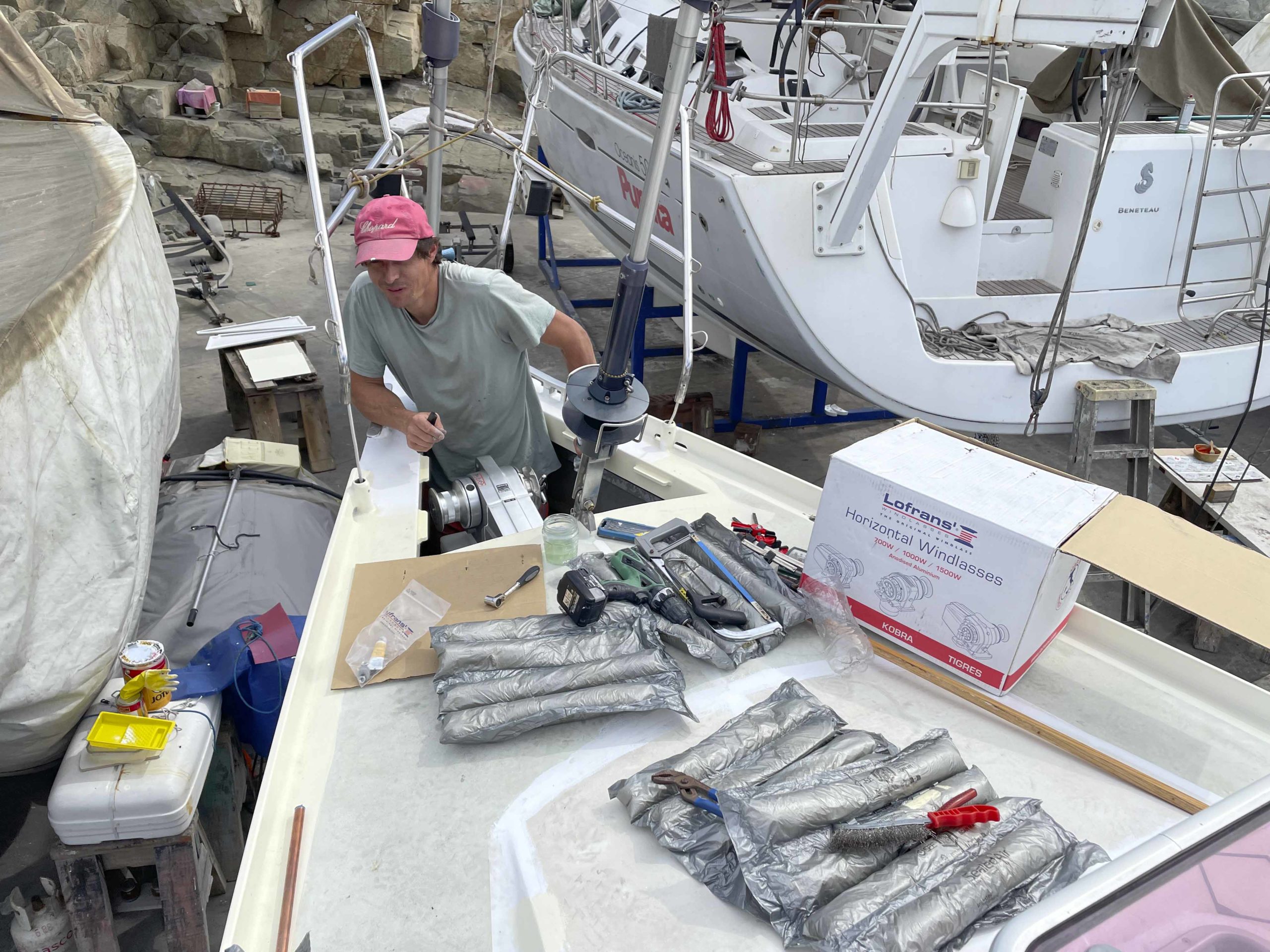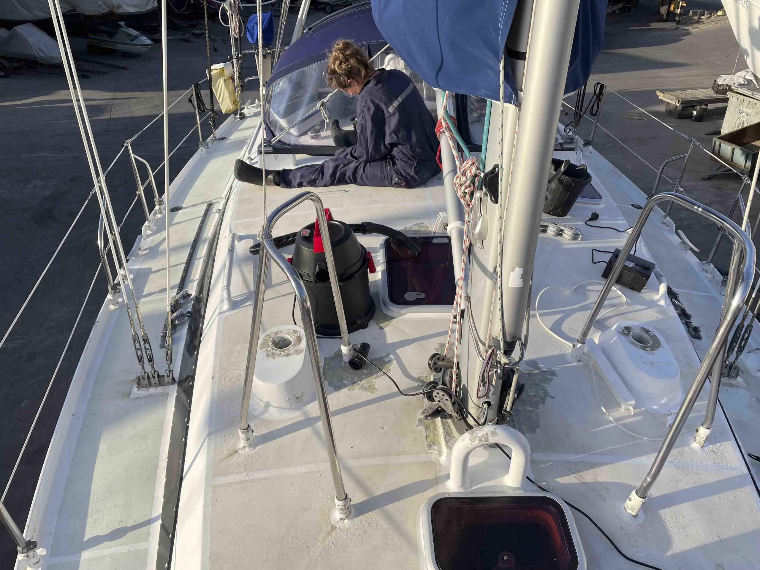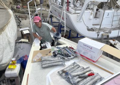 Au programme: changer le guindeau, refaire la peinture et appliquer un anti-dérapant sur tout le pont et la jupe, installer un nouveau panneau solaire, changer les bagues du safran, enlever les listons de notre table à manger, appliquer un nouvel anti-fooling, et d’autre petites babioles!